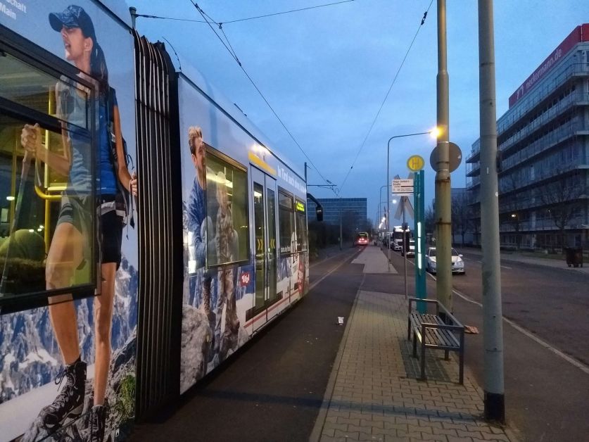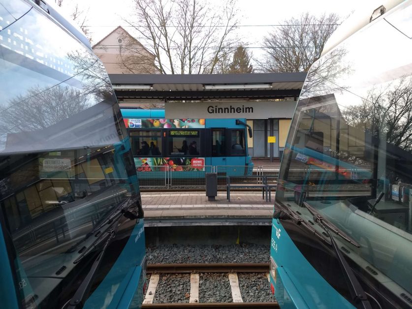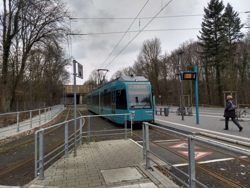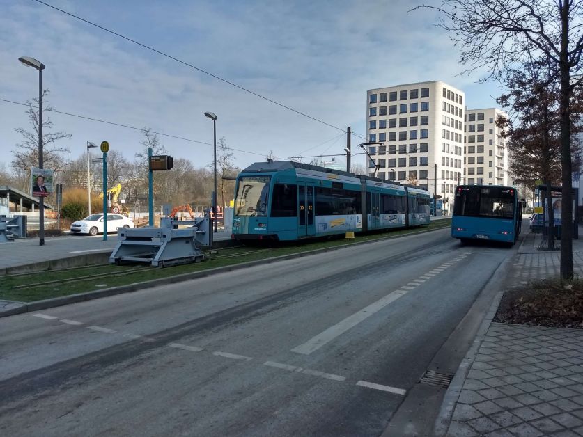 Nach einem kleinen Fußweg vom Ernst-May-Platz zur Haltestelle Saalburg-/Wittelsbacherallee ging es mit der 12 zur Hugo-Junkers-Straße, um auch „Hugo-Junkers-Straße/Schleife“ besucht zu haben. Diese Haltestelle ist wenig mehr als ein zweites Haltestellenschild am Bahnsteig der Hugo-Junkers-Straße, aber sie ist auf dem Netzplan separat eingezeichnet. Als nächstes Umsteigen in die 11 zur Schießhüttenstraße und direkt wieder zurück bis zur Ostendstraße.